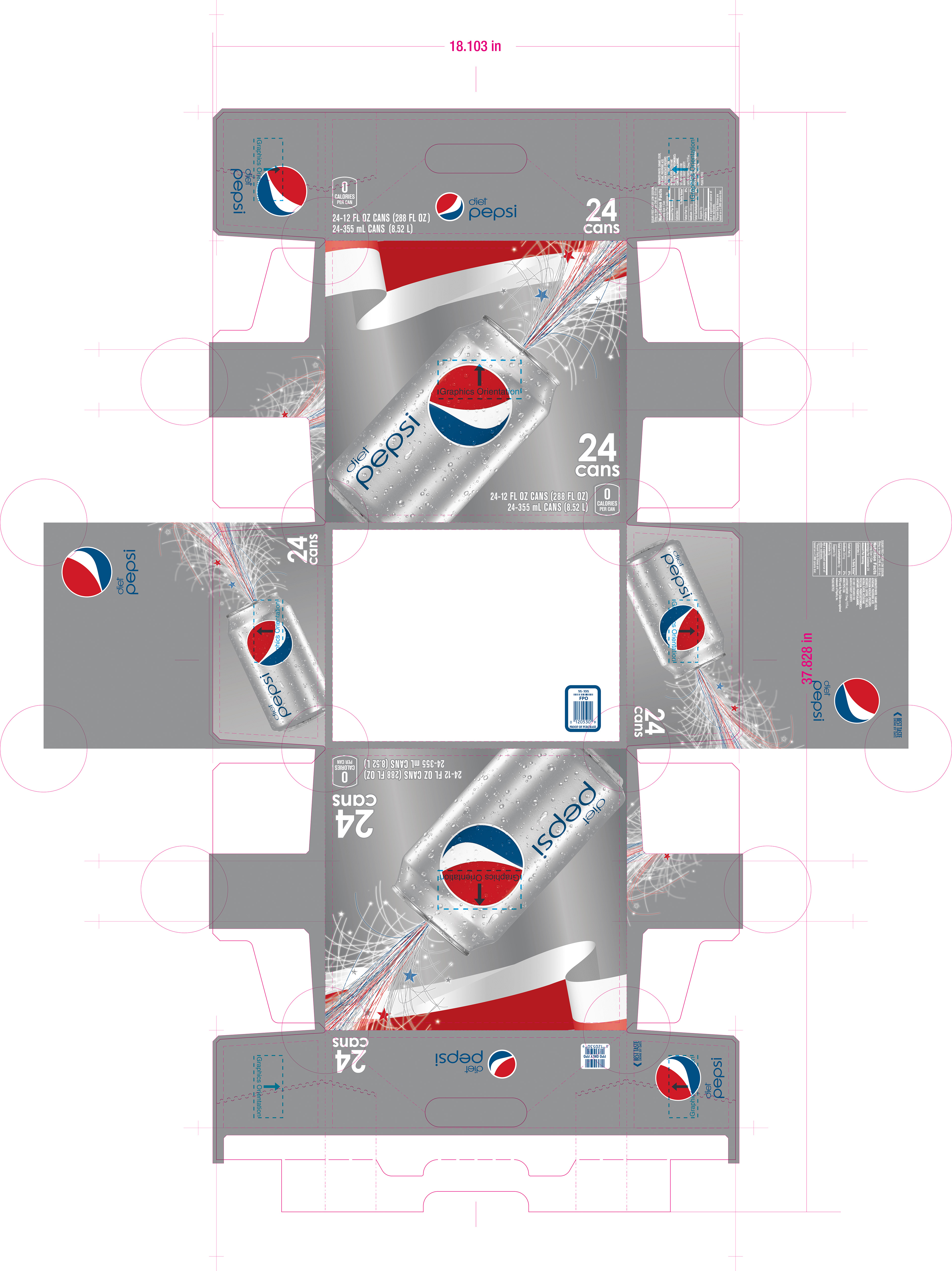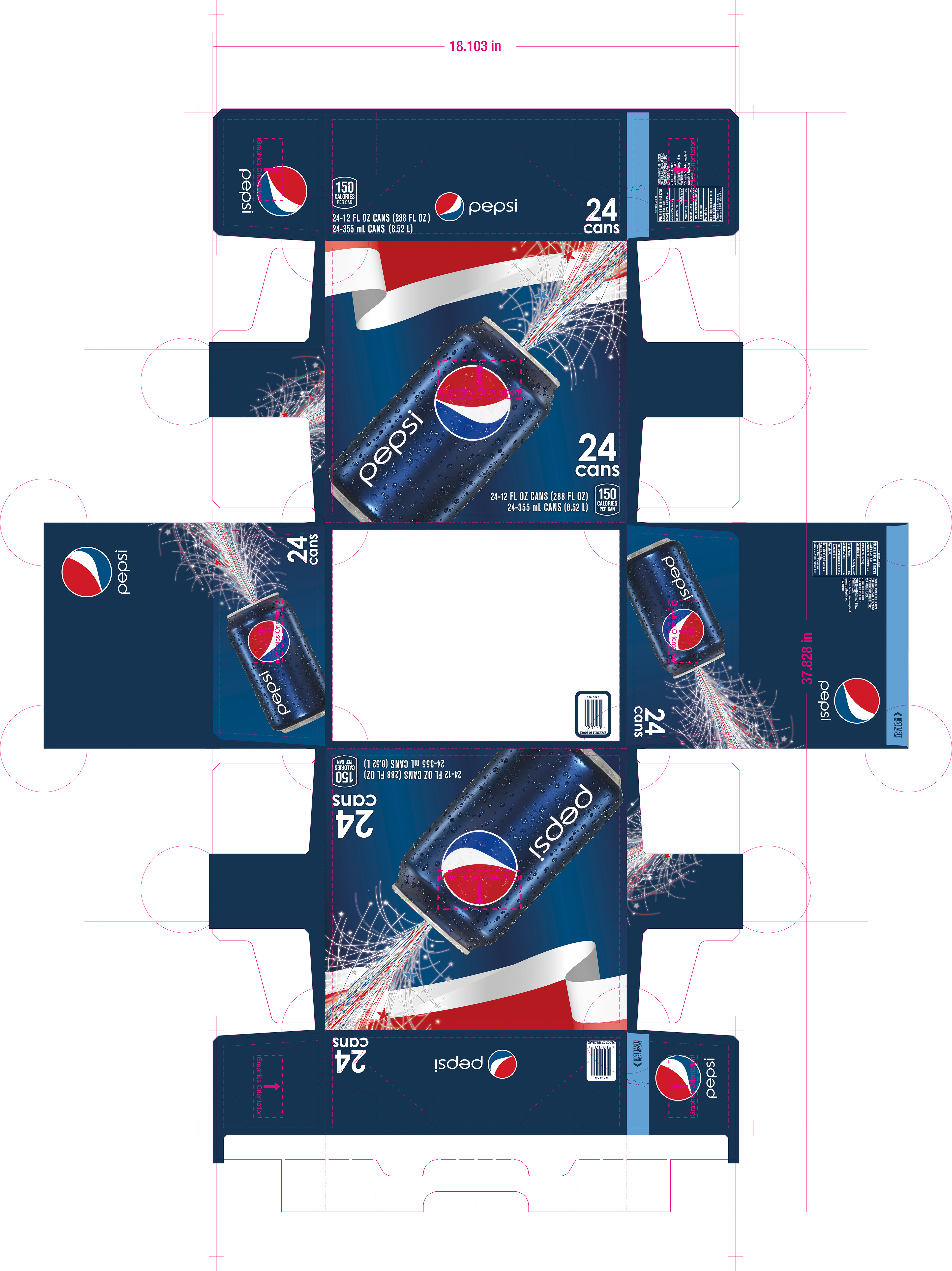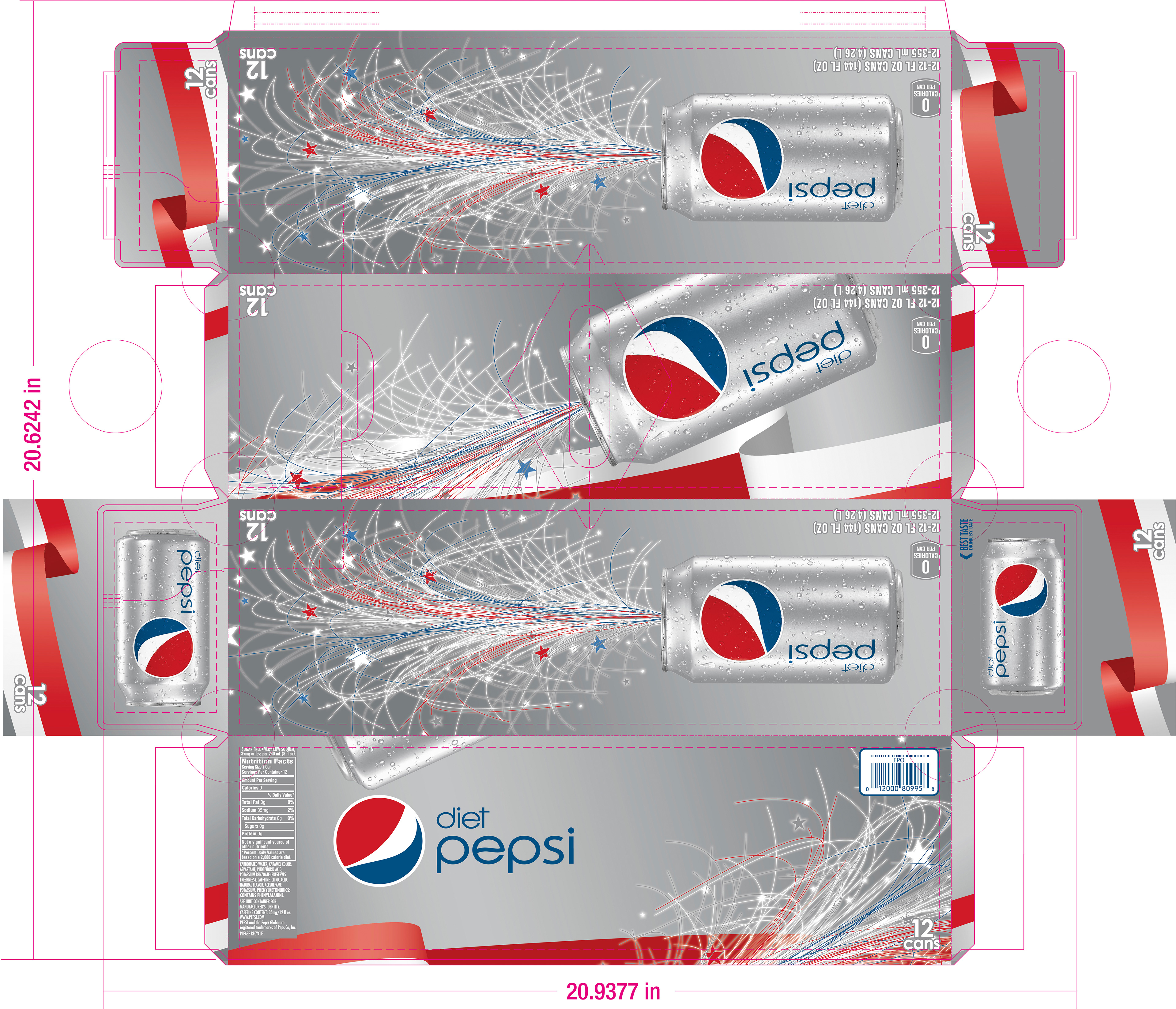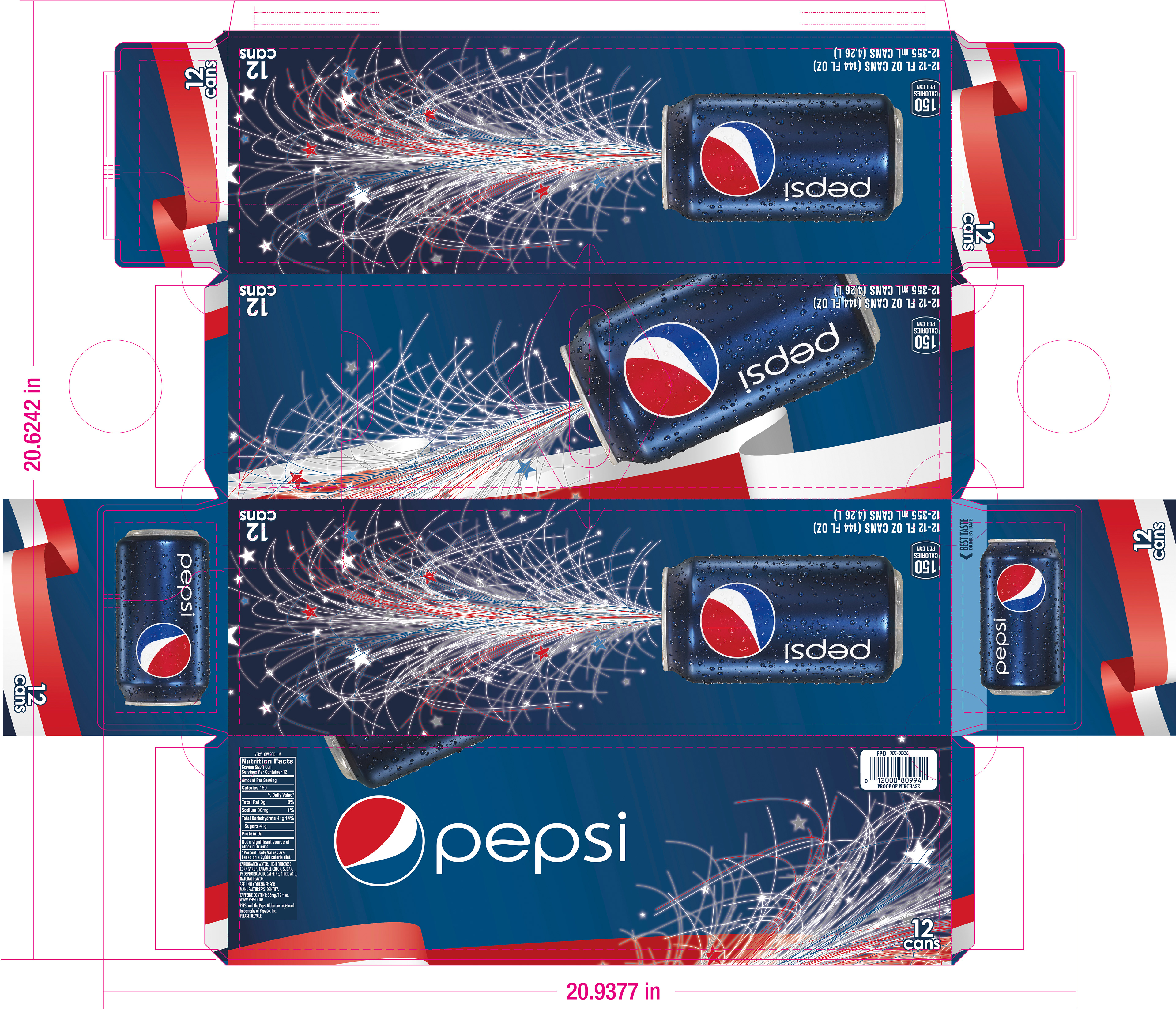 A limited run for Summer, Pepsi released promotional Fourth of July packaging with a patriotic/fireworks theme. Its intention was to create a “billboard effect”, used in seasonal displays one could see at the front of a supermarket, amongst the other Summer paraphernalia for sale. Also, the “billboard effect” continued on the short ends of the packaging for the 12 packs. These are set up on shelves in the soda aisle with the short end facing out to conserve shelf space. The patriotic ribbon would thus continue to the package right next to it. There is an example at bottom of this page from the mechanicals that I have that demonstrates the stacking display "billboard effect". It shows the long panel stacking. The thumbnail for this page is an actual photograph sent to me by my sister who is a manager at Stop & Shop, showing me they were in the process of setting up the display to achieve the desired effect. This image shows the "billboard effect" on the side panels, as well as the long panels in live promotional set up.